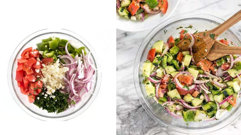 قشري الخيار إذا رغبت في ذلك. قطعي الخيار والطماطم والفلفل إلى مكعبات. قطعي البصل الأحمر شرائح رقيقة. اسحبي أوراق البقدونس من السيقان ، ثم افرميها فرماً خشنًا. فتتي جبنة الفيتا.