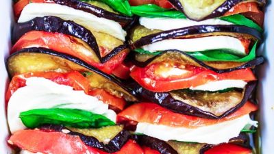 عندما يبرد الباذنجان والطماطم (البندورة) بما فيه الكفاية للتعامل معهما، يمكنك إحضار طبق الفرن (حوالي 6 × 9 ″) وتبدء بتجميع السلطة، يرتب الباذنجان والطماطم والجبن والريحان في صحن الفرن لتشكيل صفوف ضيقة. يكرر النمط حتى تقوم بتعبئة طبق الفرن من جانب إلى آخر.