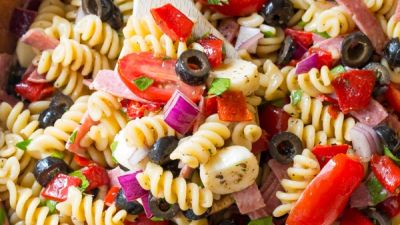 تصب الطماطم، وشرائح اللحم، والفلفل المفروم، البصل الأحمر، البقدونس، الموزاريلا والزيتون على المعكرونة. تضاف الصلصة وتقلب السلطة ثم تتبل بالملح والفلفل.