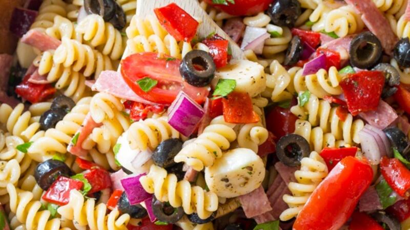 يوضع وعاء كبير من الماء على نار عالية ويترك ليغلي. تضاف ملعقة كبيرة من الملح إلى الماء. ثم تضاف المعكرونة المجففة. تطبخ وفقا لتعليمات العبوة، من 6-8 دقائق. تصفى المعكرونة، وتشطف بالماء البارد في المصفاة. ثم توضع المعكرونة في وعاء سلطة كبيرة.