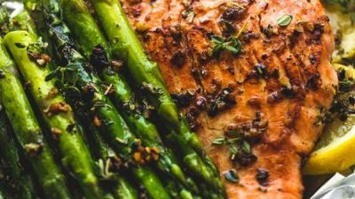 طبق سهل وصحي يحتوي على سمك السلمون الاعشاب الزبدة والهليون انها وجبة سريعة ولذيذة ستذوب في فمك.