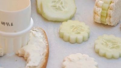 توضع شرائح الخيار فوق كل شرائح الخبز وتغطى وتوضع على طبق التقديم.