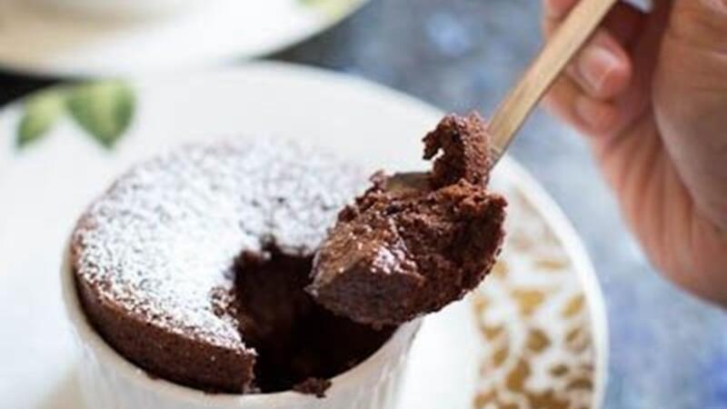 أدخلي الكوب الى الميكرويف لحوالى دقيقة حتى تنضج السوفليه قبل التقديم.