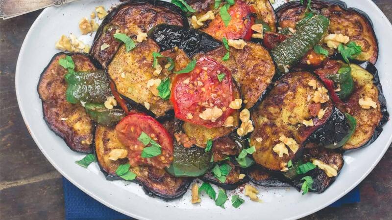 يُجمّع طبق الباذنجان المقلي. نحضر طبق تقديم كبير ، ونضع القليل من الباذنجان في الأسفل ، ثم نضيف الفلفل الأخضر ، ثم صلصة الطماطم في الأعلى. كرر حسب الحاجة حتى تحصل على جميع الخضروات على طبقك. يزين بالنعناع الطازج وقلوب الجوز.