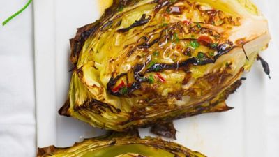 يقطع الملفوف وتدهن الجوانب بخليط الزيت. توضع الأسافين على ورقة خبز كبيرة. وتغطى بورق الالمنيوم وتشوى لمدة 45 دقيقة، يرفع الورق وتترك لمدة 10 دقائق إضافية أو حتى تصبح ذهبية اللون. تزين بالكزبرة المفرومة. وتقدم على الفور.