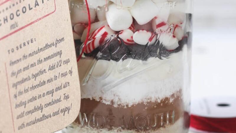 هذه الشوكولاتة الساخنة المصنوعة منزليًا هي فكرة رائعة لموسم العطلات! ضعي المكونات على شكل طبقات في جرة زجاجية مع القليل من المارشميلو.