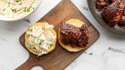 لصنع السندويشات ، ضعي قطعة دجاج باربيكيو على كل خبز وغطيها بمغرفة ممتلئة من السلطة. قدميها على الفور.