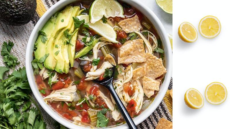 شوربة الدجاج والليمون خفيفة وطازجة ولذيذة مع قطع الدجاج والخضروات والكزبرة الطازجة ومرق الليمون المنعش...