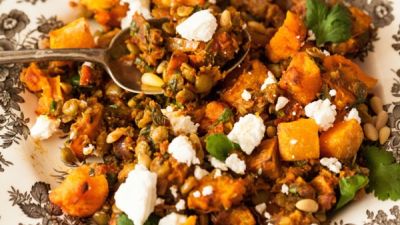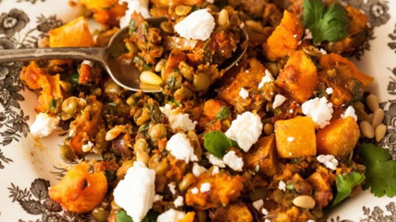يضاف خليط العدس متبل إلى المقلاة مع القرع المحمص حتى يغلف بالتساوي. يضاف البقدونس والكزبرة المتبقية.