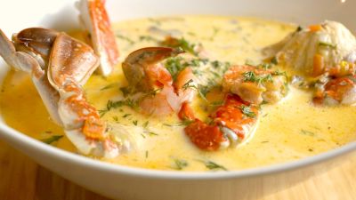 في وعاء عميق، يشوح البصل والثوم مع الزبدة مع إضافة المستكة.2- بعد ذلك، يضاف المحار والكابوريا مع التقليب.3- ثم نضيف الجمبري والسبيط وقطع سمك الهامور مع التقليب حتى يتغير اللون.4- يضاف لتر من الماء أو حتى يغطي جميع المكونات.5- بعد الغليان يضاف الكرفس المقطع والملح والفلفل الاسود أو الأبيض مع الحبهان وورق الغار.6- بعد أن تنضج جميع المكونات تماما، تضاف نصف كوب من الكريمة اللباني مع رشة من جوزة الطيب، ثم تقدم في إناء التقديم.