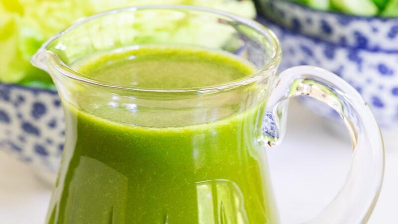 تمزج جميع المكونات باستثناء الزيت في معالج الطعام أو الخلاط. حتى يصبح الخليط اخضر ناعم ومشرق.