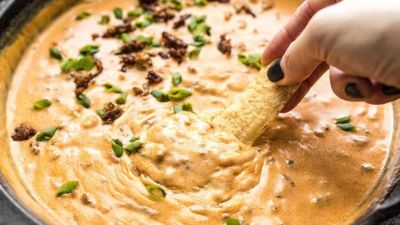 بمجرد ذوبان كل الجبن في الغموس ، أطفئ النار. زينها بشرائح البصل الأخضر.