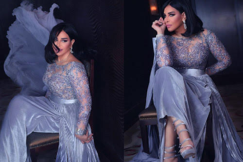 اختارت أحلام لإطلالتها فستان باللون الفضي الضارب على بنفسجي