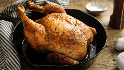 سخني الفرن عند درجة حرارة 180 درجة مئوية. في وعاء كبير، ضعي الملح والفلفل الأسود ونصف كمية البهارات ونصف كمية الزيت والثوم، ثم أضيفي الدجاج، وقلبي جيدًا.