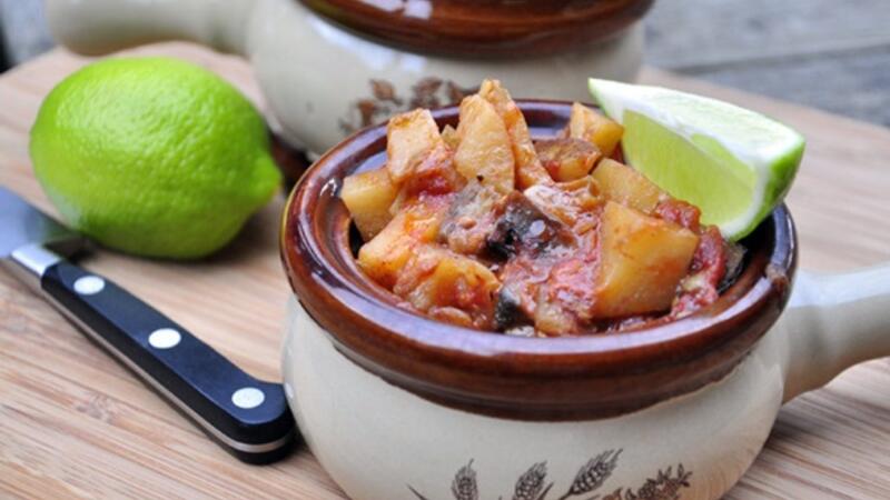 في مقلاة كبيرة، يوضع الزيت على نار متوسطة الى منخفضة، ويطهى الباذنجان حتى يصبح بنيا خفيفا، ثم ينقل الى قدر أو طاجن الطبخ البطيء. تضاف قطع البطاطس والفطر الى الباذنجان.