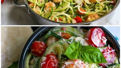 وجبة سهلة في قدر واحد مع مزيج من الروبيان والطماطم الطازجة، وشعيرية الكوسا، وصلصة ألفريدو.