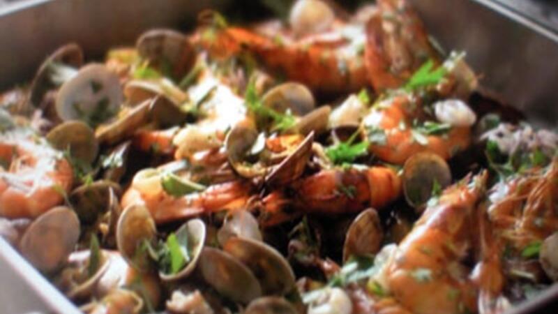 يسكب خليط فواكه البحر في صينية ثم يوضع في الفرن على درجة حرارة 160، لمدة 15 - 25 دقيقة إلى أن ينضج.