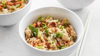 تضاف صلصة القلي المحضرة إلى المقلاة مع الاستمرار في الطهي والتقليب لمدة 2-3 دقائق أخرى. أخيرًا ، يضاف مزيج الكرنب والفول السوداني المفروم ويقلب لمدة 1-2 دقيقة أو حتى يبدأ الكرنب في الذبول. يوضع فوقها شرائح البصل الأخضر ورذاذ سريراتشا ، ثم تقدم!