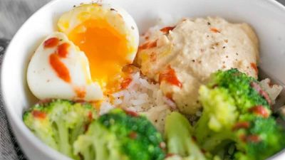 يُضاف الحمص والبيض المطبوخ ورشة ملح وفلفل إلى وعاء الأرز والبروكلي. رشي مع السريراتشا ورشي بذور السمسم فوقها. يتمتع!