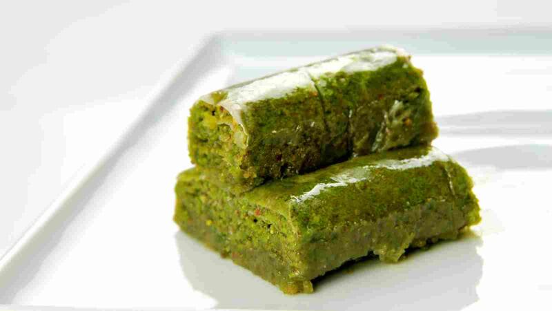 - نقسم البقلاوة إلى مربعات متساوية الحجم، ثمّ ننثر الفستق الحلبي المطحون فوقها.