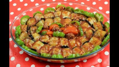 وزعي الحشوة على شرائح الباذنجان المقلي ثم لفيها على شكل رول وثبتيها بعود أسنان.