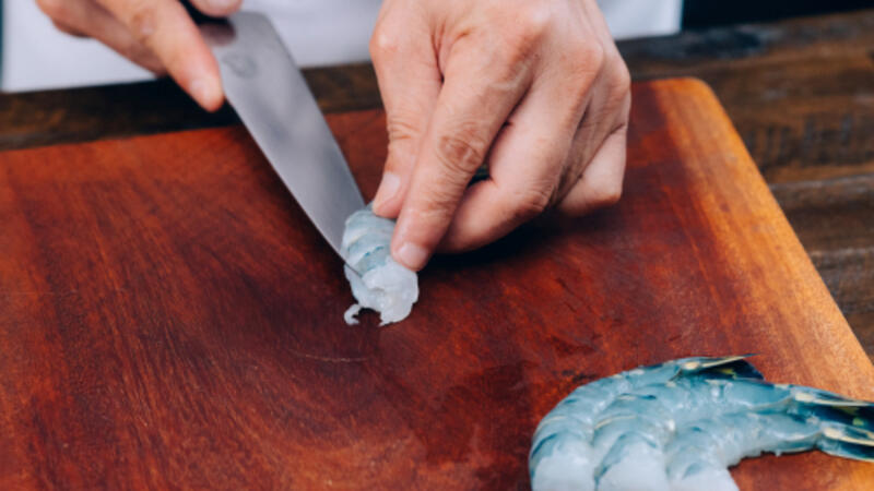 5- نلاحظ وجود خيطٍ أسود اللون، على امتداد الظهر، وهذا الخيط يعتبر الأمعاء التي تحتوي على الأوساخ والسموم، لذلك عدم إزالتها سيشكل خطراً على صحة الإنسان في حال أكلها، حيث يتمّ إزالة هذا الخيط إذا لم يكن بارزاً من خلال شق الظهر في المنطقة التي تحتوي على الخيط باستخدام سكينة رفيعة، ثم نسحب الخيط بحذر، أمّا إذا كان الخيظ ظاهراً وبشكلٍ واضح على الظهر، فيتمّ سحبه مباشرة دون شق الظهر، ولكن في حالة قطع الخيط أثناء السحب، سيكون من اللازم شّق الظهر لاستخراج الجزء المتبقي.