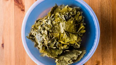 3- ضعي كميّة ورق العنب في الماء المغلي لمدّة خمس دقائق وأخرجيه واغسليه بماءٍ بارد حتّى يتوقّف طهيه.