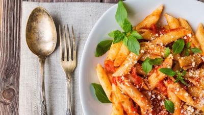 - ثم نسكب الباستا بالصلصة الحمراء في أطباق التقديم ونُزيّنها بأوراق الريحان وجبنة البارميزان ونقدّمها ساخنة، وصحتين وعافية.