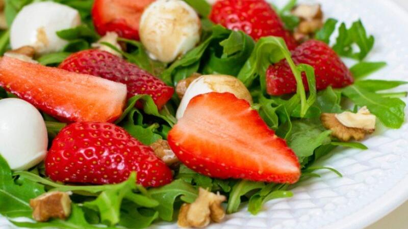 مقادير سلطة الجرجير بجبن الموزريلا والفراولة