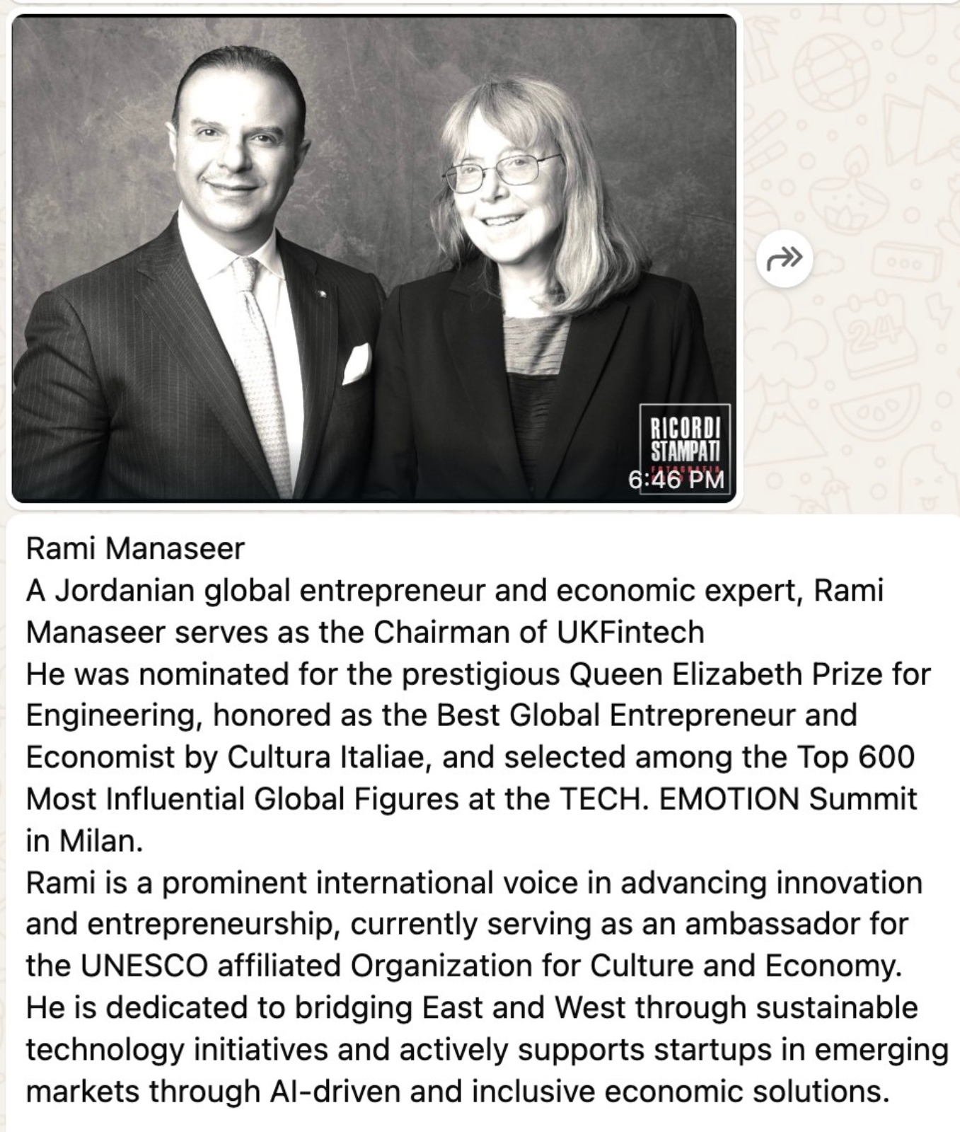- تعيينه سفيرًا لمنظمة الثقافة والاقتصاد التابعة لليونسكو في إيطاليا مما عزز من مكانته العالمية كمؤثر في الابتكار والتنمية المستدامة.