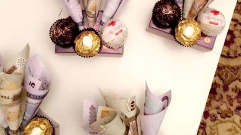 توضع حبات الشوكولاتة في تنسيق معين، ثم تلف الاوراق النقدية وتثبت اسفل الشوكولاتة.