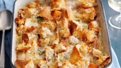 - تصب في طبق تقديم عازل للحرارة وتضاف قطع الخبز له. يطبخ لمدة 30 دقيقة حتى يصبح الخبز ذهبيًا.