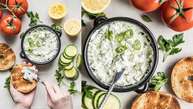 جبنة كريمة بالبصل الأخضر مملوءة بالأعشاب مثالية للسندويشات واللفائف أو حتى تناول الوجبات الخفيفة على الخضروات الطازجة.