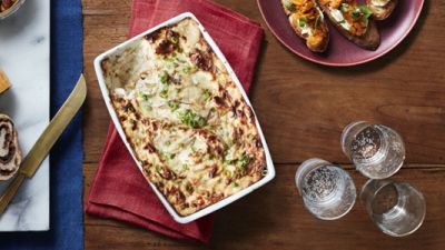 ينقل الخليط إلى طبق مخصص للفرن، ويخبز حتى يصبح لونه ذهبيا، 15-18 دقيقة. يرش مع كمية من البصل الأخضر، إذا رغبت في ذلك، ويقدم مع الرقائق والخضروات.