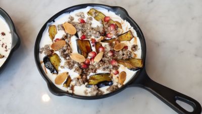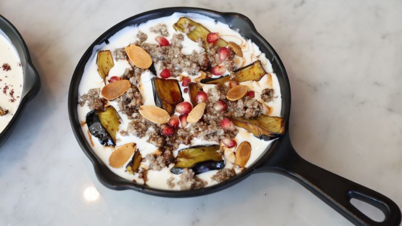 • يُوزّع في طبق التقديم، خليط الباذنجان واللحم، ثم يُسكب فوقه مزيج اللبن والطحينة.