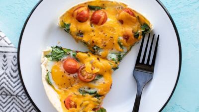 أخرجي بيض التورتيلا المخبوز من الفرن. قطّعيه إلى أربع قطع ثم قدميها!