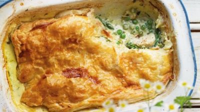 يصب الخليط في صينية بايركس وتوضع أوراق الباف بستري فوقه ثم تدهن بالبيض المخفوق.