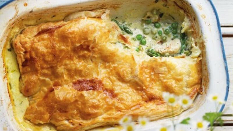 تسخن الزبدة في نفس المقلاة حتى تذوب، يضاف الدقيق، ثم تطهى لمدة دقيقة أخرى. ترفع عن الحرارة وتضاف الكريمة بلطف مع التحريك. يوضع مرة أخرى على الحرارة، ويترك حتى يغلي لمدة 3 دقائق، مع التحريك باستمرار، حتى يصبح سميكا. يضاف الدجاج والهليون والبازلاء والبقدونس ويتبل حسب الرغبة.