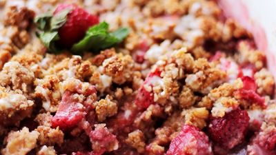 يضغط الخليط بين الأصابع ويرش على الفراولة.
