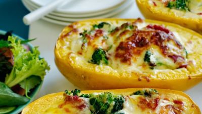 يتبل القرع بملعقة صغيرة من الملح والفلفل ، ثم باستخدام شوكة تخرج خيوط السباغيتي، وتتركهم داخل القرع. يقسم خليط الجبن بين انصاف القرع وتوضع طبقة من الصلصة ، ثم جبنة الموزاريلا. يسخن حتى يتم تسخين الحشوة جيدا من اعلى وتتحول الى اللون البني الذهبي، من 2 إلى 3 دقائق. يقدم مع سلطة خضراء ، إذا رغبت في ذلك.