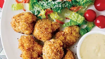 تدهن قطع الناجتس بالزيت بفرشاة خاصة. تقلب اثناء الخبز للحصول على لون ذهبي لمدة 20 دقيقة تقريبا. تقدم دافئة.