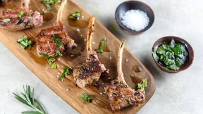 - تفرك العجينة على جانبي شرائح لحم الضأن وتترك متبلة لمدة 30 دقيقة على الأقل في درجة حرارة الغرفة.