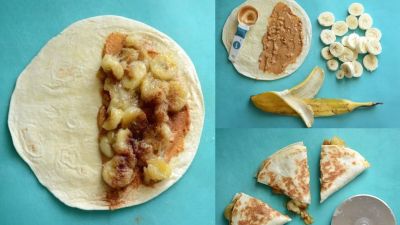 هل تحتاج إلى حلوى سريعة؟ استخدمي الموز الناضج والكاراميل وزبدة الفول السوداني والقرفة لصنع حلوى " QUESADILLA " المكسيكية.