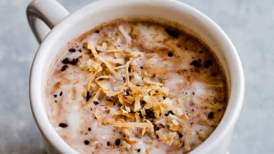 - يوزع الكاكاو على الاكواب وتزيّن بجوز الهند المحمص ورشة قرفه ولوز.