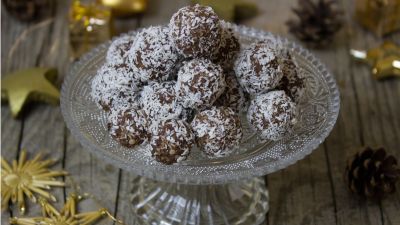 تغمس الكرات بالشوكولاتة الذائبة ثم تغمس بجوز الهند وتوضع في الثلاجة حتى تبرد.