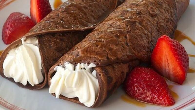 7. ضعي نصف قطعة البراوني بالكريب ولفيها بالشكل الواضح بالفيديو.