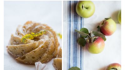 في وعاء آخر ، يخفق البيض والسكر ولبن الزبادي وزيت الزيتون معًا. تصب المكونات الرطبة على الجافة حتى تمتزج جيدا. لا تخلط المزيج وإلا سيصبح صلبا. تضاف مكعبات التفاح في الخليط وتصب في القالب، ¾ تقريبا.