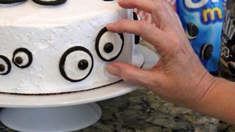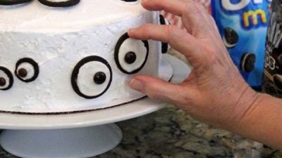 ملاحظة: أنت بحاجة الى الدقة في العمل والسرعة، يمكنك صنع البسكويت أولا ثم تحضير الكعكة والصاق العيون مباشرة.