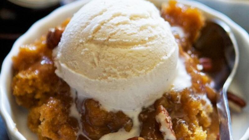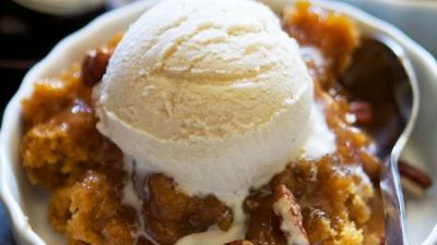 في وعاء منفصل، يخلط السكر، السكر البني والبيكان معا. يفرد الخليط فوق الجزء العلوي بالتساوي. يصب الماء الساخن على كل شيء ويخبز لمدة 40 دقيقة أو حتى ينضج. {تأكد من وضعه على ورقة خبز في حالة ظهور الفقاعات}. يترك ليبرد من 5-10 دقائق قبل التقديم. يقدم مع المزيد من البيكان وآيس كريم الفانيليا.