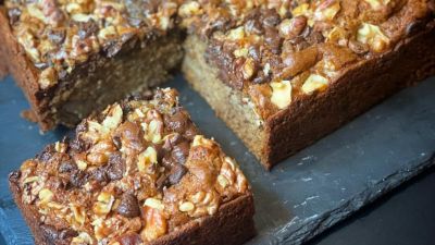 - اضيفي الجوز والتشوكلت تشب على الوجه واخبزيها في فرن حرارته ١٨٠ لمدة ٤٥ دقيقة، وصحتين وعافية.